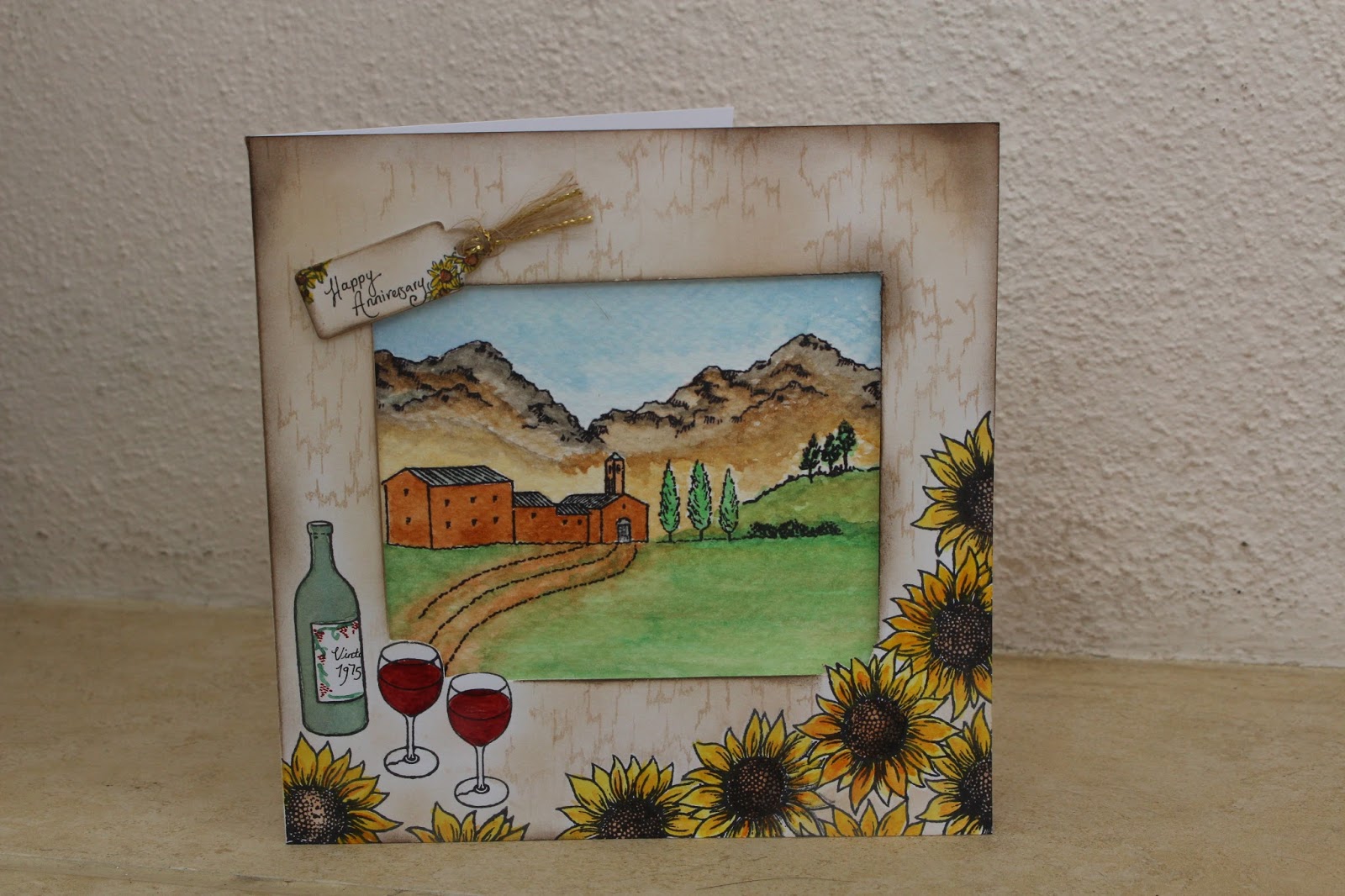 I stamped the 'view' first on to watercolour paper and then painted with my watercolours. On a separate card blank I stamped the wine and sunflowers using a mask to overlap them. I trimmed an aperture in the card using a craft knife and steel edge ruler. I used a stamp from the hobby art textures set around the frame in versa colour sand beige and then inked over the top with the same ink and some DI ground espresso.